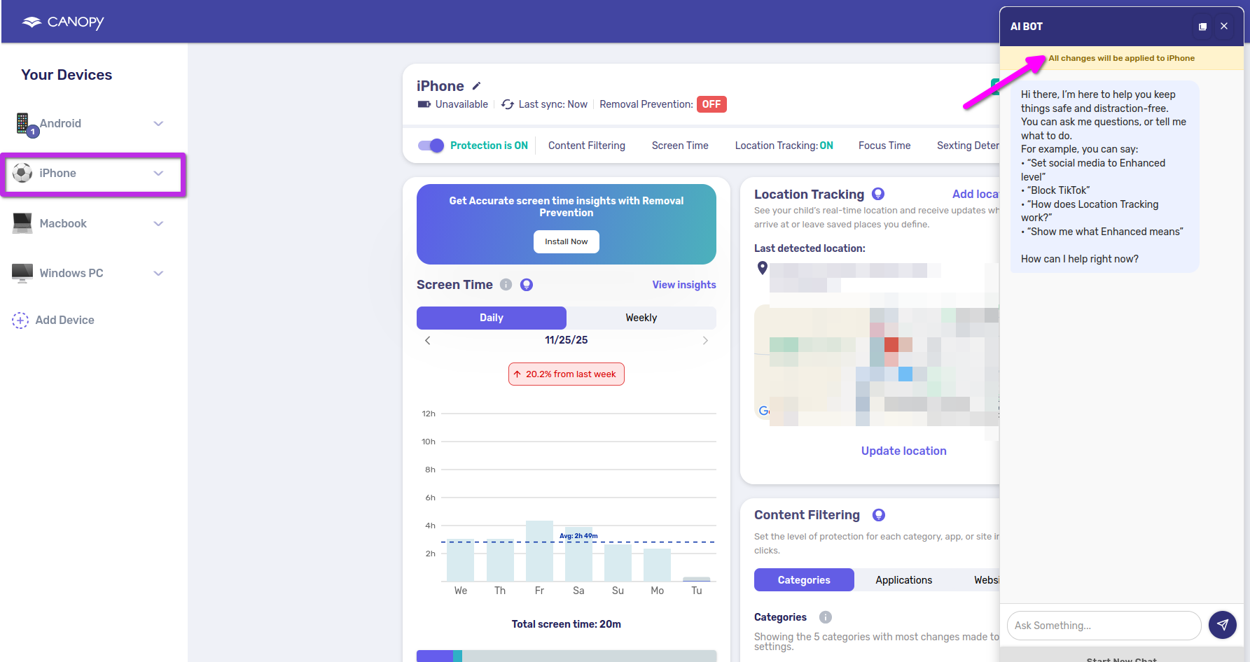 The AI Support Assistant is available only to the account managers, the persons who control filtering settings in the Canopy Dashboard.